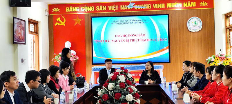 Đoàn công tác của trường THPT Phan Huy Chú - Quốc Oai do gặp gỡ và chia sẻ khó khăn với trường Mầm Non Quang Trung do ảnh hưởng của thiên tai