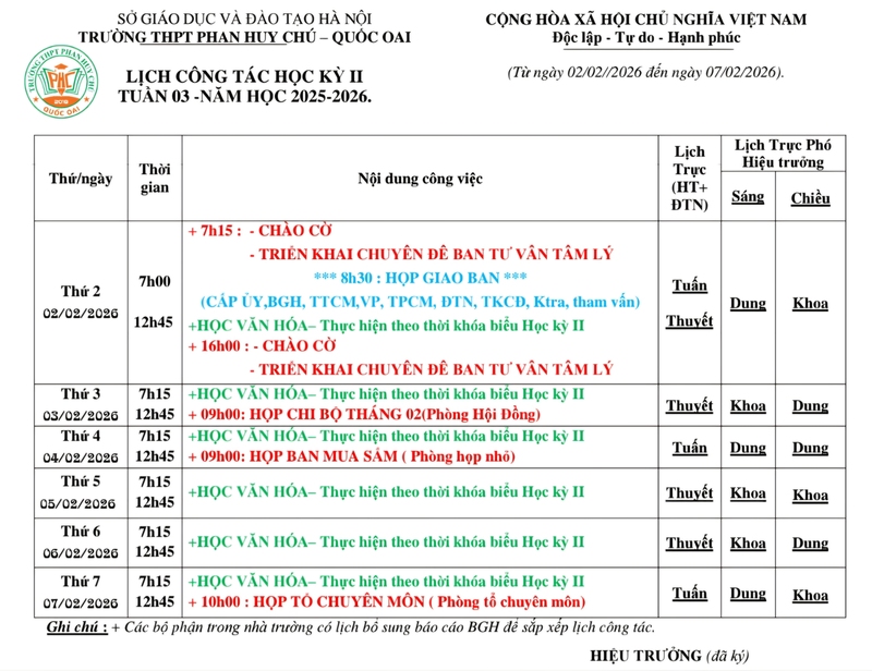 Lịch công tác tuần 3 học kì II Năm học 2025-2026