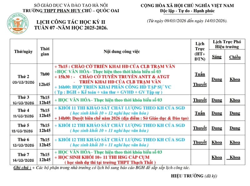 Lịch công tác tuần 7- Học kì II