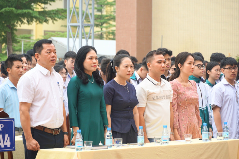 Đại biểu tham dự, cán bộ giáo viên, nhân viên và toàn thể đoàn viên thanh niên nhà trường thực hiện nghi lễ chào cờ