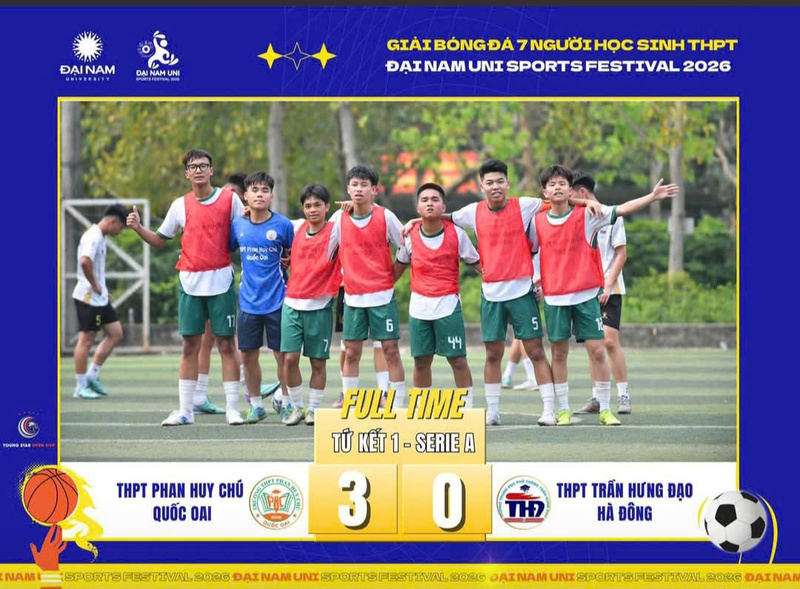 Trận Tứ kết 1 của giải đấu Dai Nam University Sports Festival 2026 đã diễn ra trong bầu không khí sôi động và vô cùng kịch tính. Bước vào trận đấu quan trọng này, đại diện của trường chúng ta phải đối đầu với một đội bóng được đánh giá cao là THPT Trần Hưng Đạo - Hà Đông.